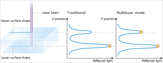 多層模式也可以對透明樣品的各層進行分析。例如,即使該樣品是玻璃基板上的透明樹脂涂層,也可測量出透明材料下那層的形狀和粗糙度,當然也可以測量出表面覆膜的厚度。